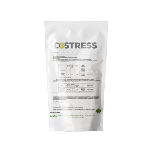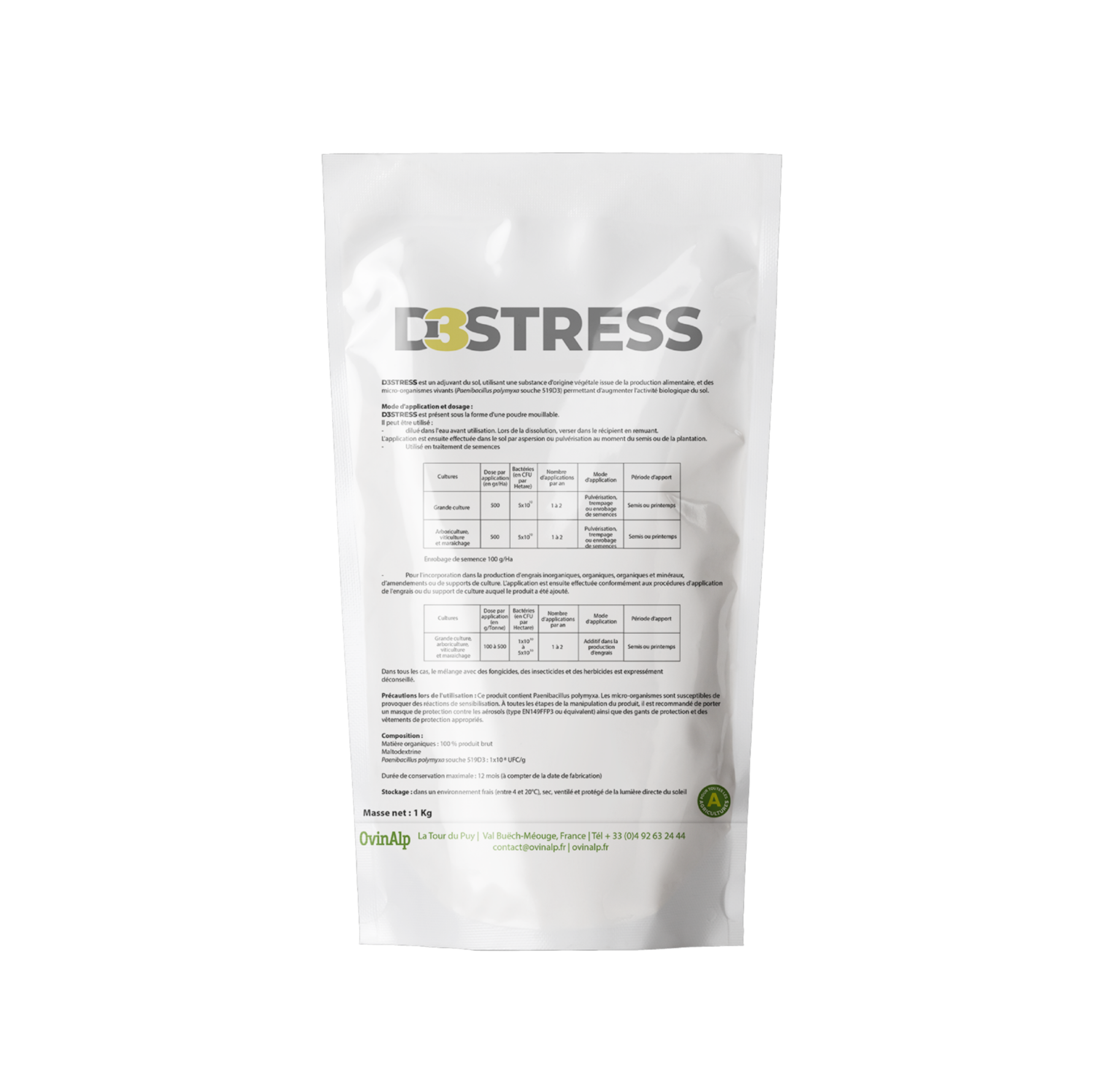 D3STRESS est un biostimulant microbien sous forme de poudre mouillable, formulé à partir de Paenibacillus polymyxa souche 519D3, une bactérie PGPR (Plant Growth Promoting Rhizobacteria) issue de la recherche et innovation OvinAlp.