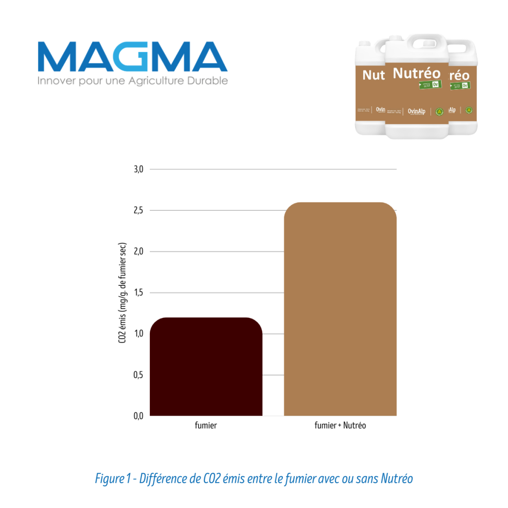 Les mesures réalisées montrent que le fumier traité avec NUTREO émet 118 % de CO₂ en plus qu’un fumier non traité.