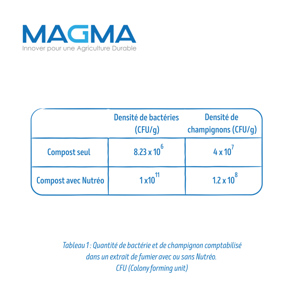 Les essais montrent que l’utilisation de Nutréo stimule fortement l’activité biologique lors du compostage du fumier. Cette stimulation se traduit par une activité respiratoire microbienne plus intense, une multiplication importante des bactéries et des champignons, ainsi que par la production d’un compost plus stable et biologiquement actif.